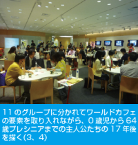 その後、11のグループごとに、想定した主人公の17 年後を描いていった。2013年に生まれた現在0歳の赤ちゃんから、2030年には81歳になる64歳のプレシニアまで、11人の男女の17年後の暮らし。参加者はいずれもマーケティングの担当者であるため、日頃から世代ごとの価値観や行動特性など基本的な情報は頭の中に入っている。各自頭の中の引き出しからあれこれ取り出しながら、主人公たちの具体的な意識や感情、行動といったディテールに落とし込んでいき、17年後のHAPPY な生活を描いていった。 途中、メンバー交代を行いながらフリップチャートに描かれたペルソナシートを完成させ、ポスターセッションを交えた後に、最後はグループごとにペルソナシートからのエッセンスを4枚の紙芝居にまとめて発表。最後の4枚目はその主人公の2030年の暮らしを象徴する漢字一文字で締めくくる発表とした。